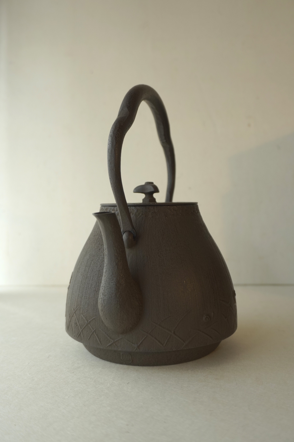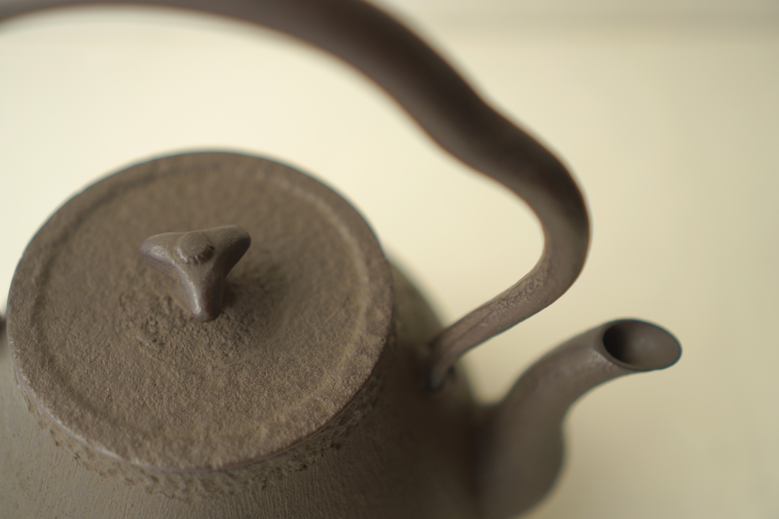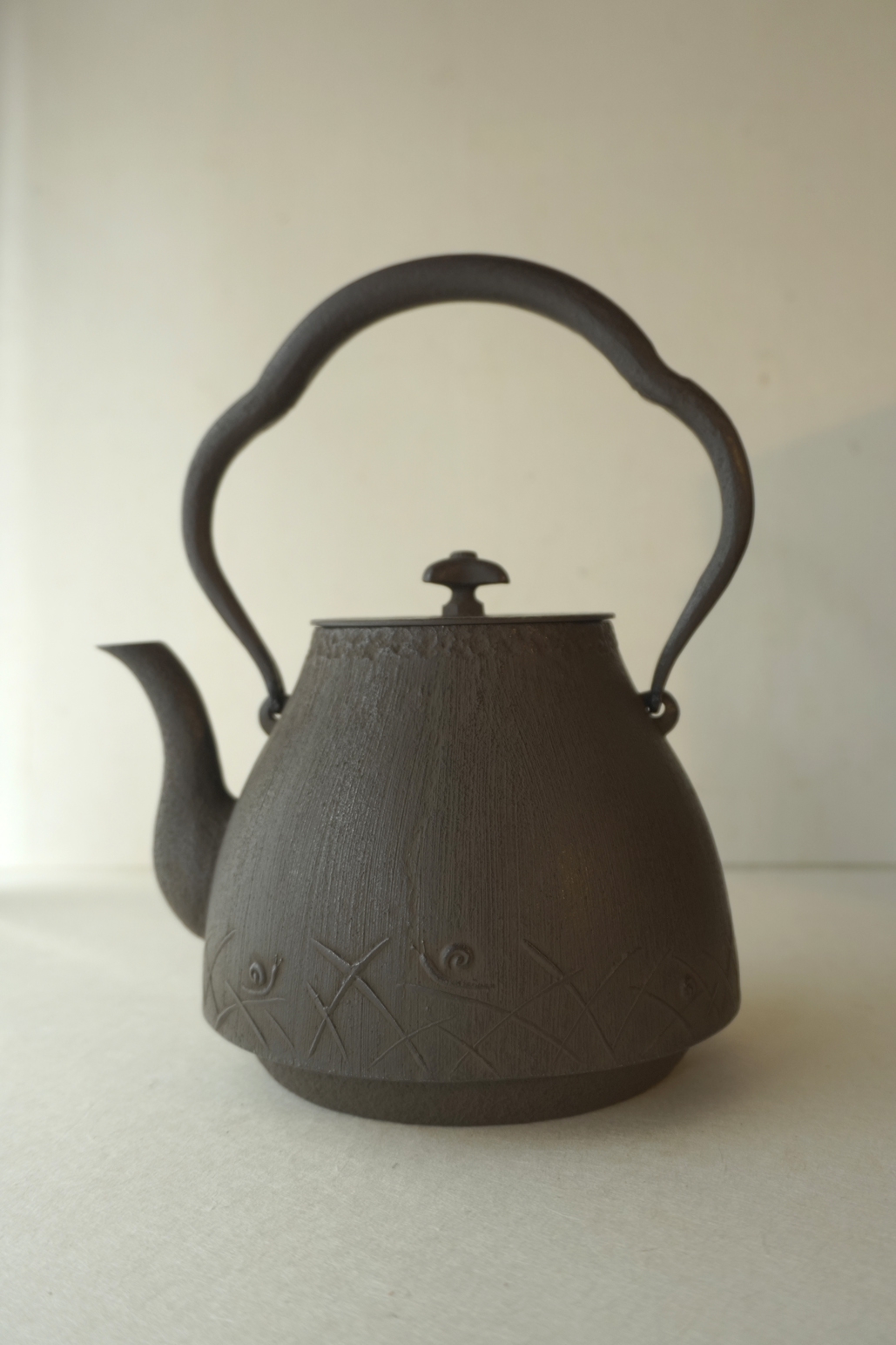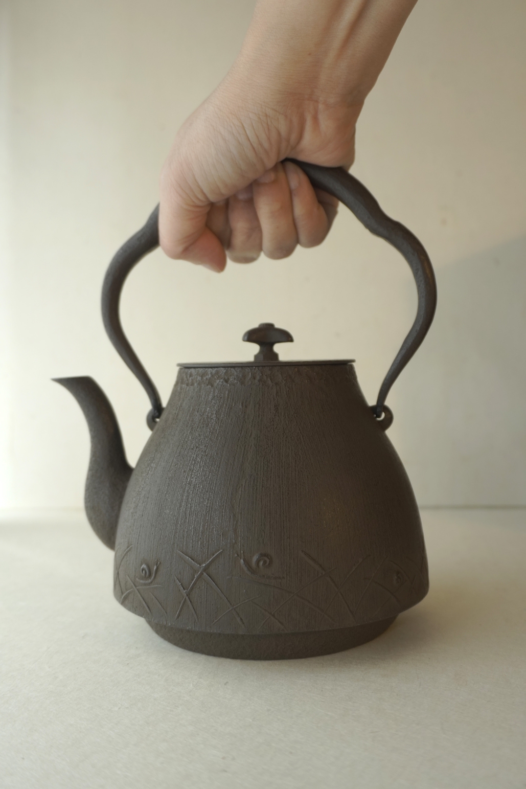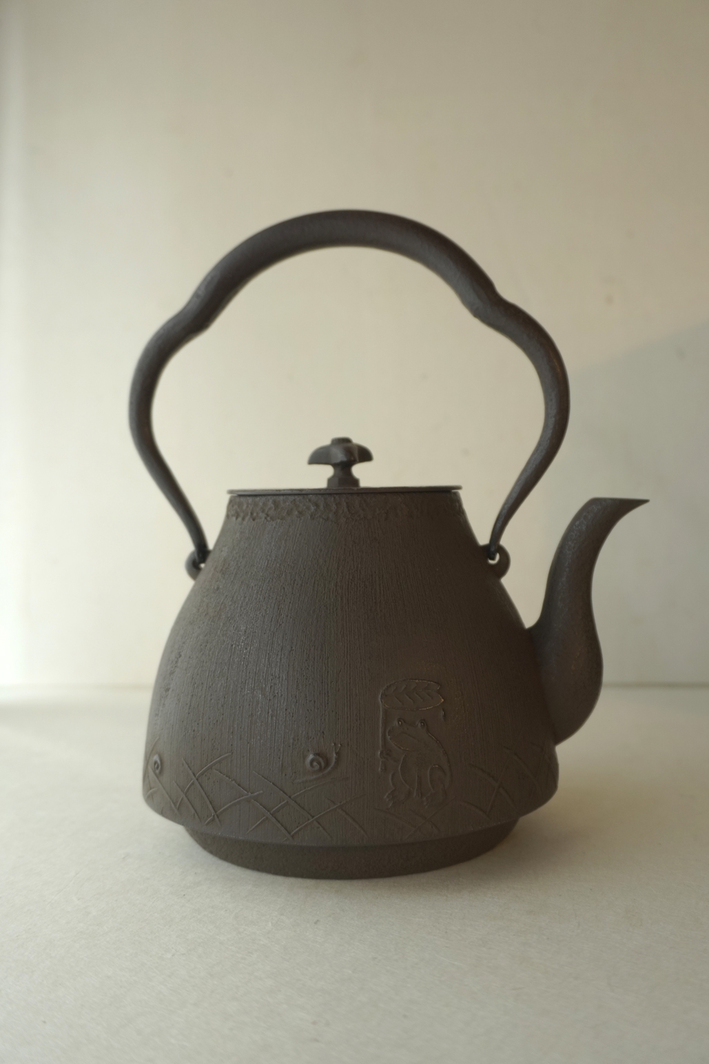 鉄瓶「カエルのかーちゃん」 愛嬌いっぱいの鉄瓶。 摘みにもユーモアが溢れています。 茶漆/蓋穴なし 1.0ℓ 45,000 +tax (税込 49,500 円) 底面の直径:110mm 本体口径:mm 本体幅:145mm 本体高:115mm (鉉含む:mm) オーダー可 (黒漆でのオーダーもできます)