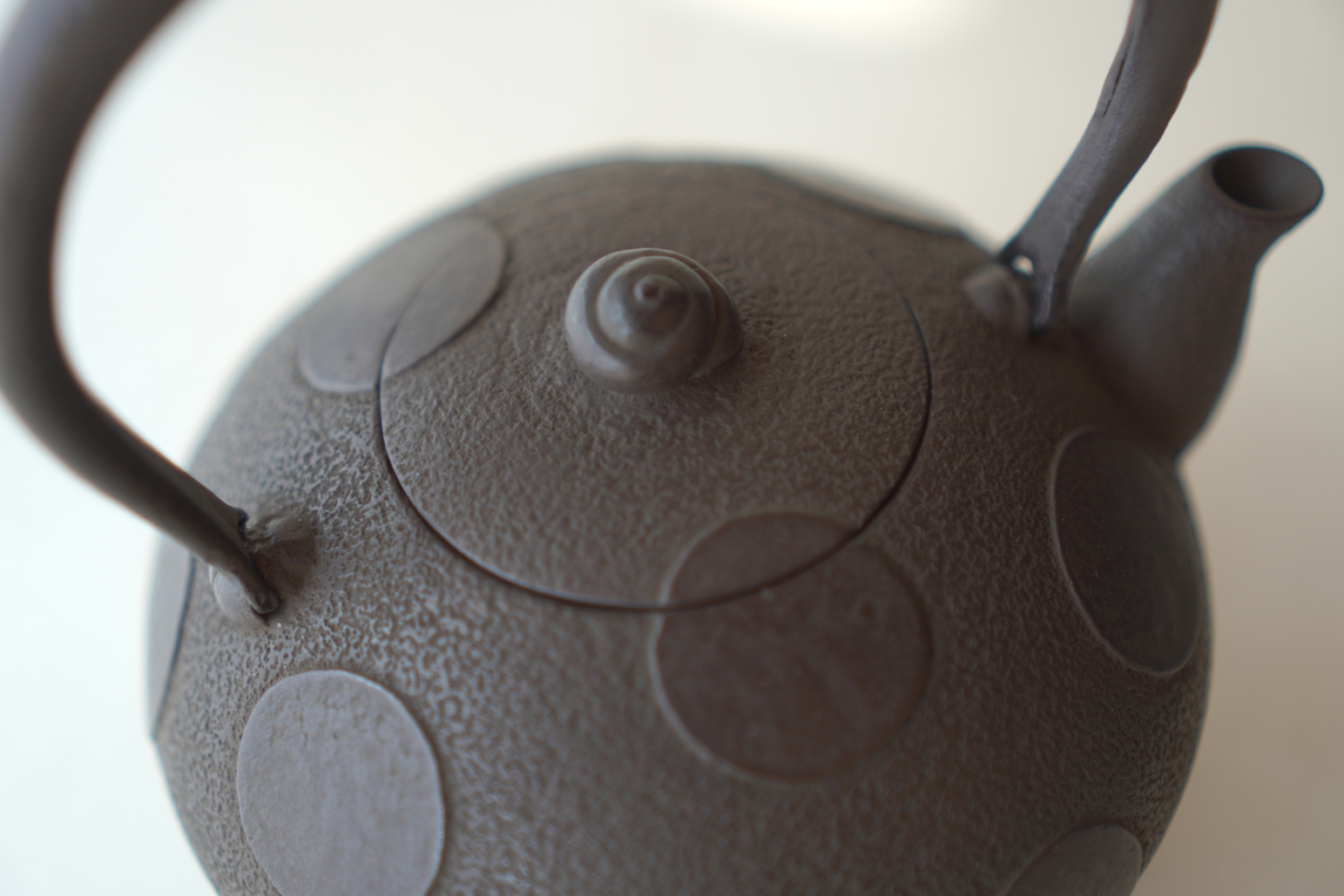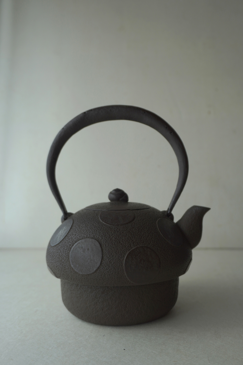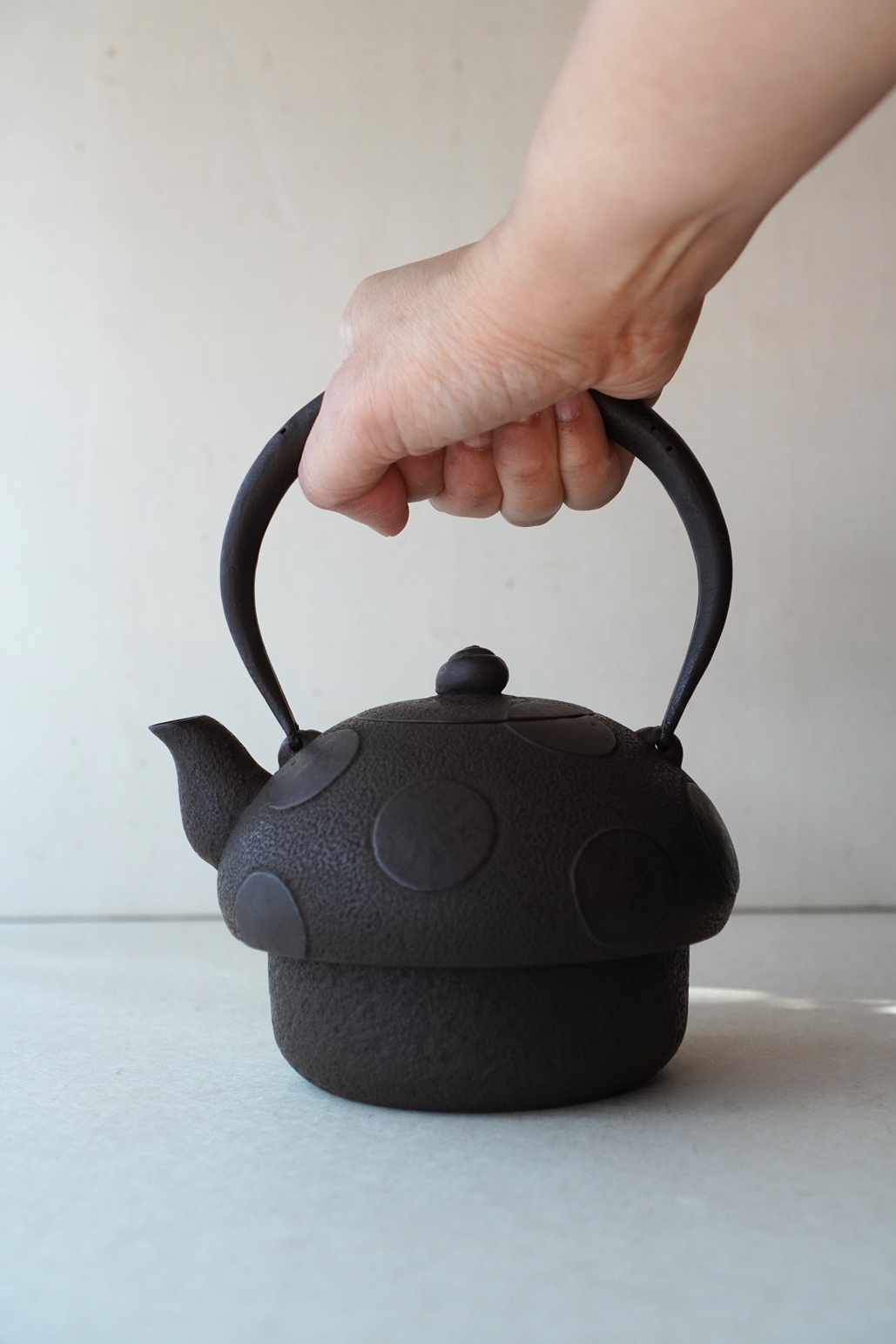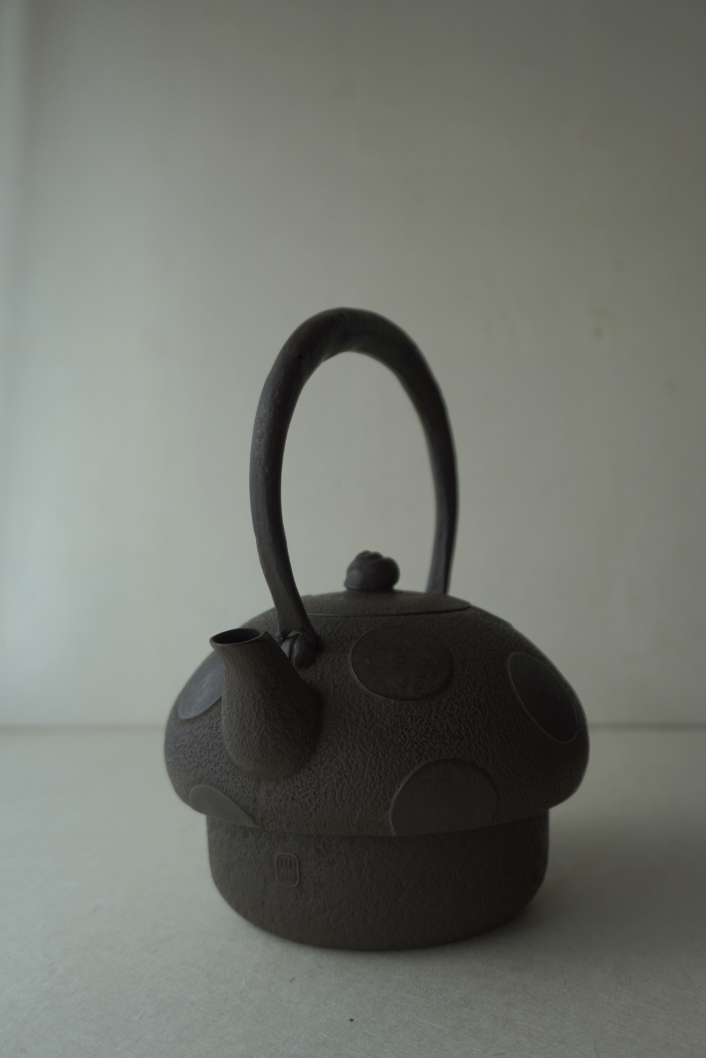 鉄瓶「キノコで一休み」 袋鉉/茶漆/蓋穴なし 0.5ℓ 65,000 +tax (税込 71,500円) 底面の直径:85mm 本体口径:mm 本体幅:130mm 本体高:90mm (鉉含む:mm) オーダー可 (黒漆、ご希望の摘みでのオーダーもできます) ※紐巻きご希望の場合は袋鉉ではなくお値段も変わります。 リス摘み。 このような摘み変更もできます