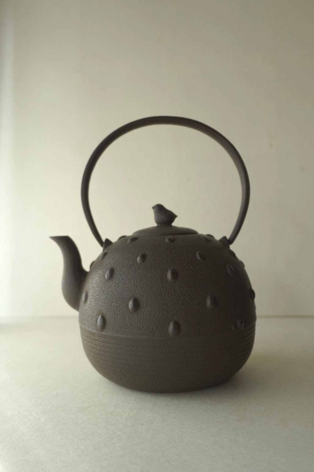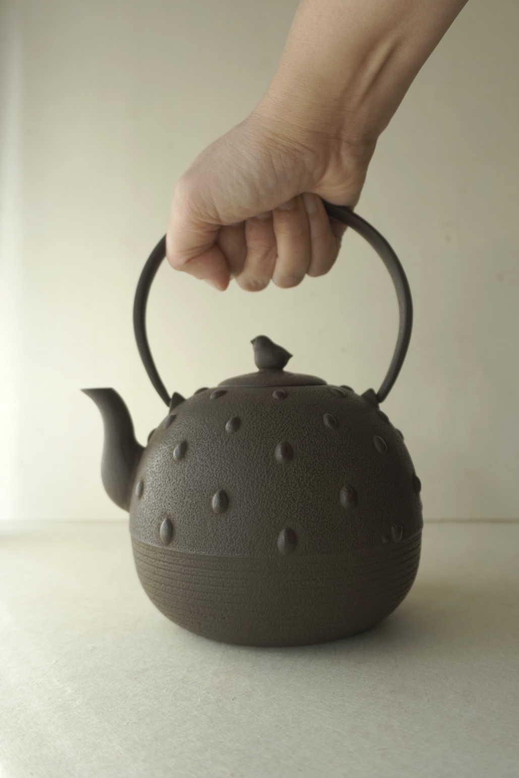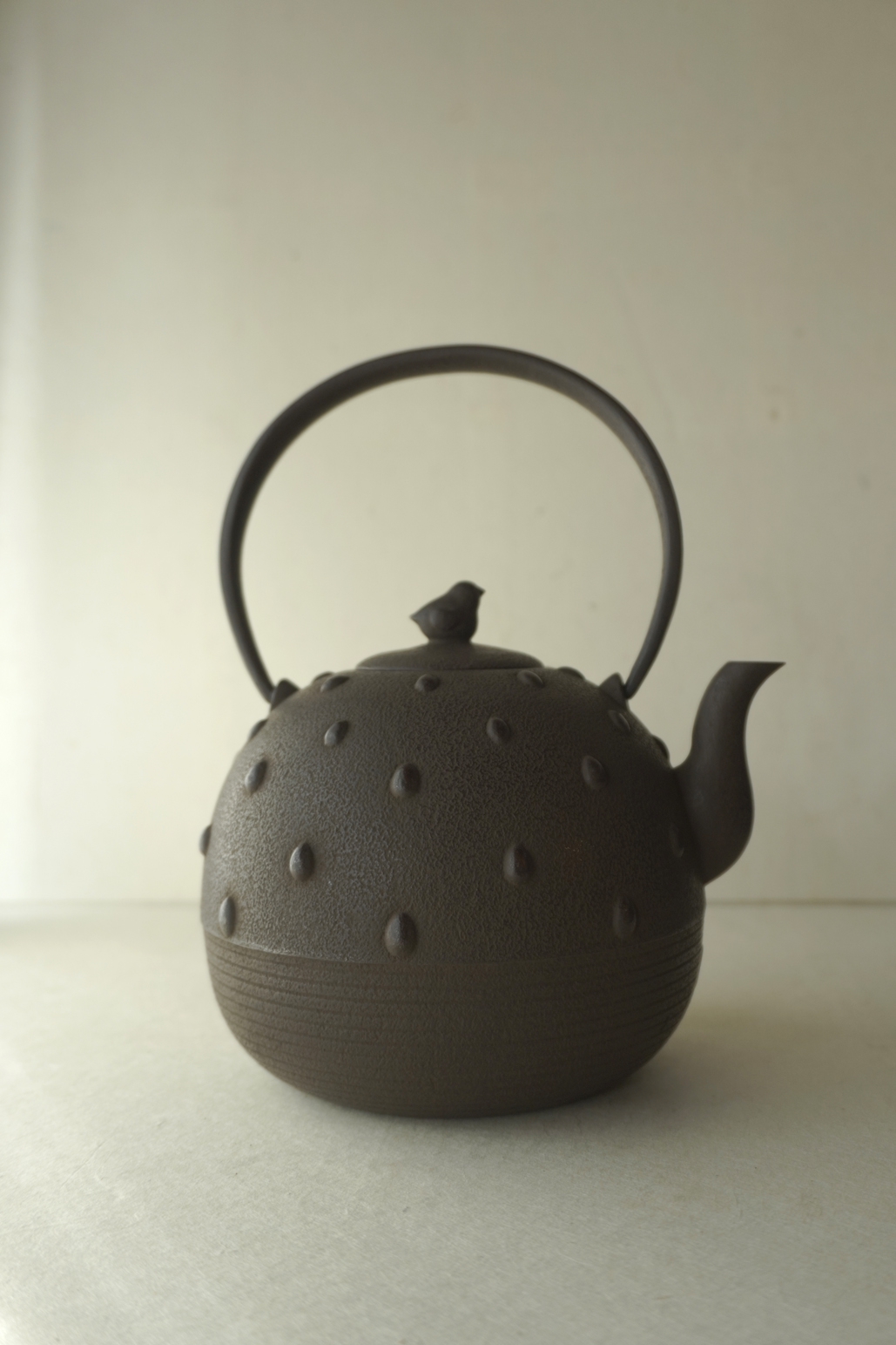 鉄瓶「たまごもん」ひよこツマミ 卵の形の模様の鉄瓶の上にいるのはヒヨコで、 下を見てみると…割れた卵が一つ。 茶目っ気のある鉄瓶です。 茶漆/蓋穴あり 1.2ℓ 45,000 +tax (税込 49,500 円) 底面の直径:90mm 本体幅:140mm 本体高:110mm (鉉含む:210mm) オーダー可 (黒漆、紐巻き、摘み指定のオーダーもできます) 本体口径:45mm