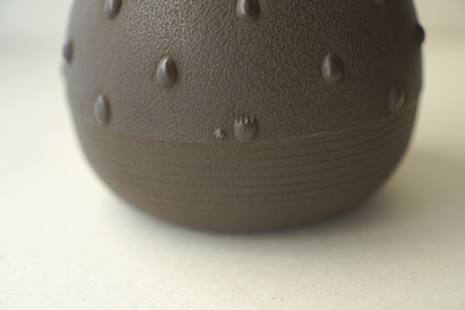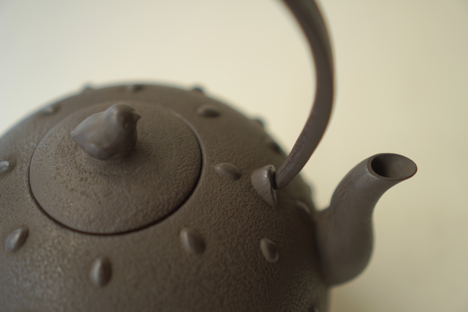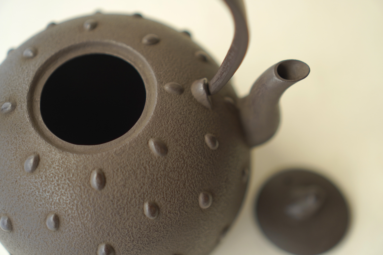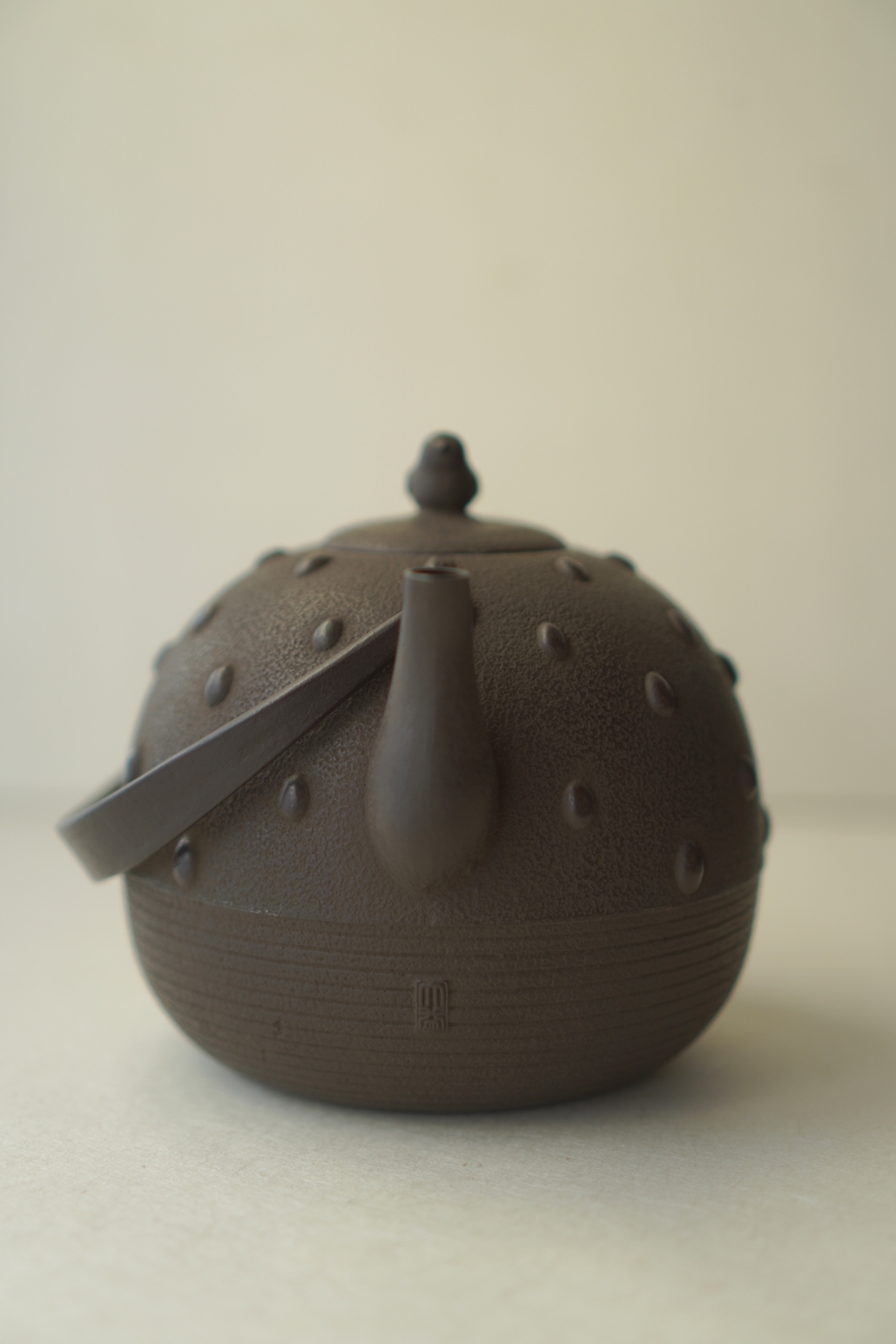 鉄瓶「たまごもん」ひよこツマミ 卵の形の模様の鉄瓶の上にいるのはヒヨコで、 下を見てみると…割れた卵が一つ。 茶目っ気のある鉄瓶です。 茶漆/蓋穴あり 1.2ℓ 45,000 +tax (税込 49,500 円) 底面の直径:90mm 本体幅:140mm 本体高:110mm (鉉含む:210mm) オーダー可 (黒漆、紐巻き、摘み指定のオーダーもできます) 本体口径:45mm