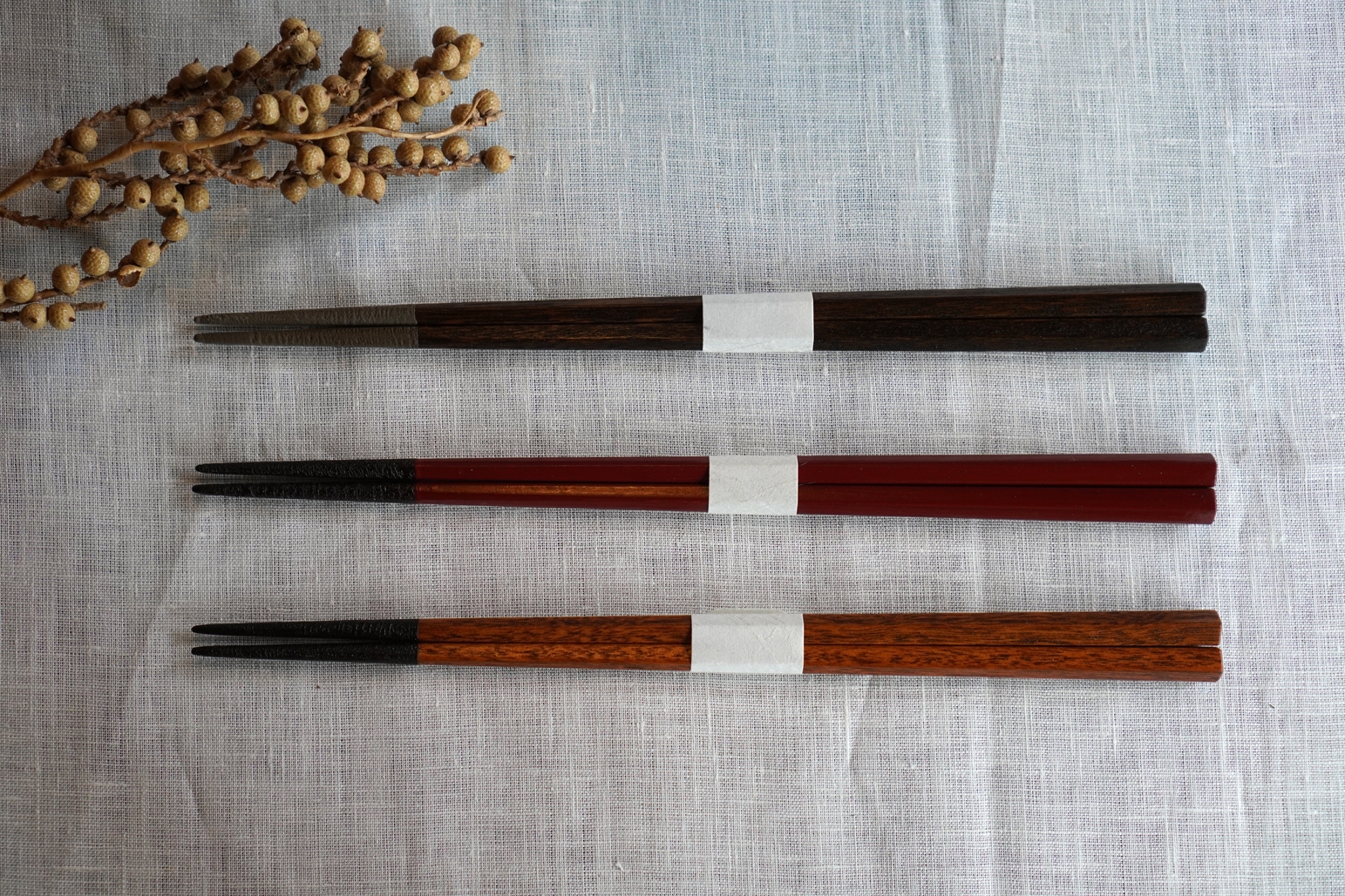 拭き漆五角箸 23cm 茶漆/黒漆 ともに3,850円(税込) 赤漆 4,400円(税込) 手に馴染む五角形。 先端も摘みやすい工夫が施されています。 お使いになっているとどうしても漆が落ちてきますが、 もし破損や塗り直しなど必要になった場合も 無償で修繕してくださいますので 末永く安心してお使い頂けます。