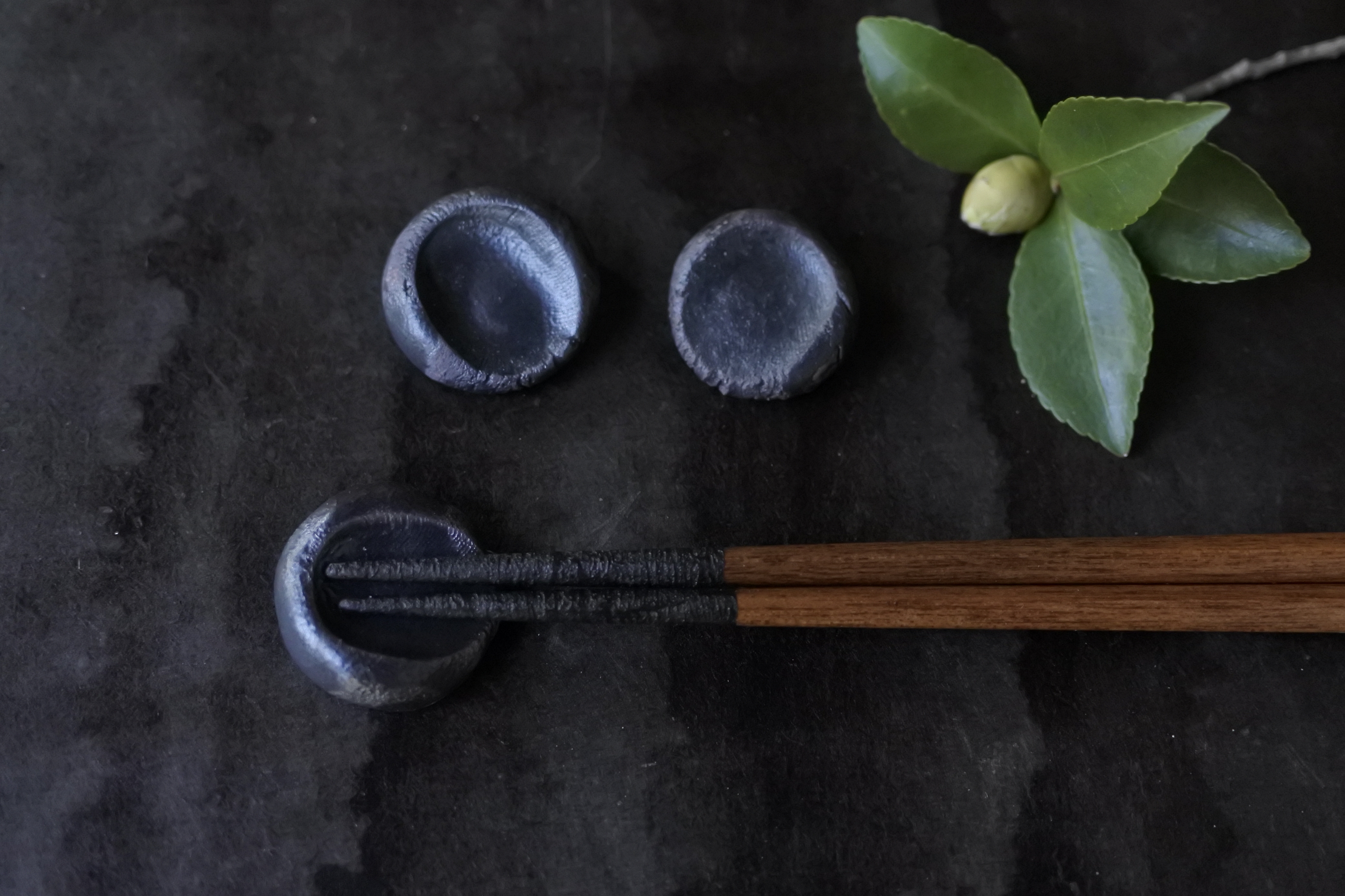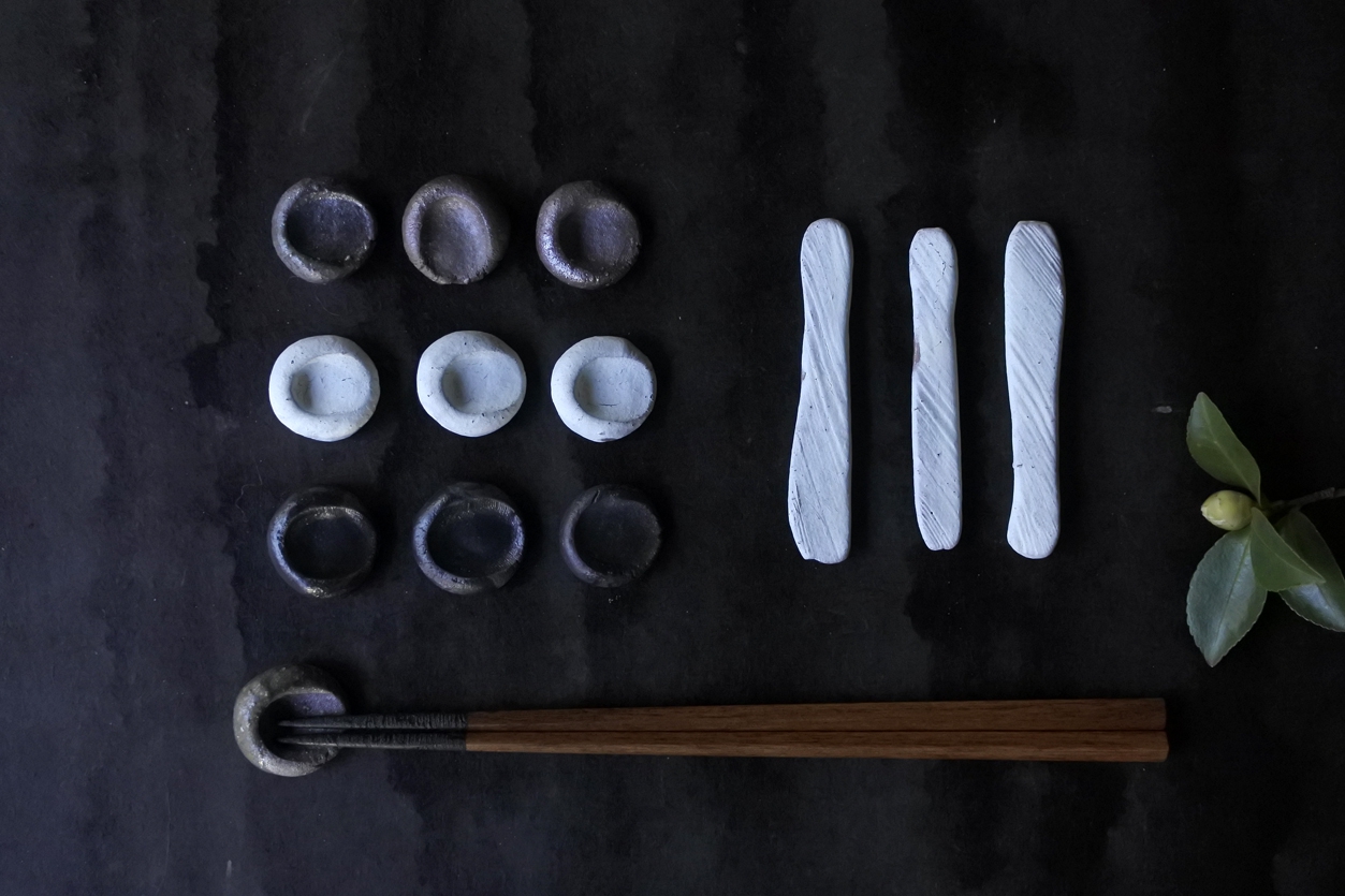 箸置き いずれも 700 +tax 長いタイプはレストにもお使い頂けます。 丸いものはお箸の収まりがよく、きちんと揃います。 (五角箸/蝶野秀紀) 粉引丸 在庫 1点 粉引 長 焼締め 丸 粉引 丸 黒釉 丸
