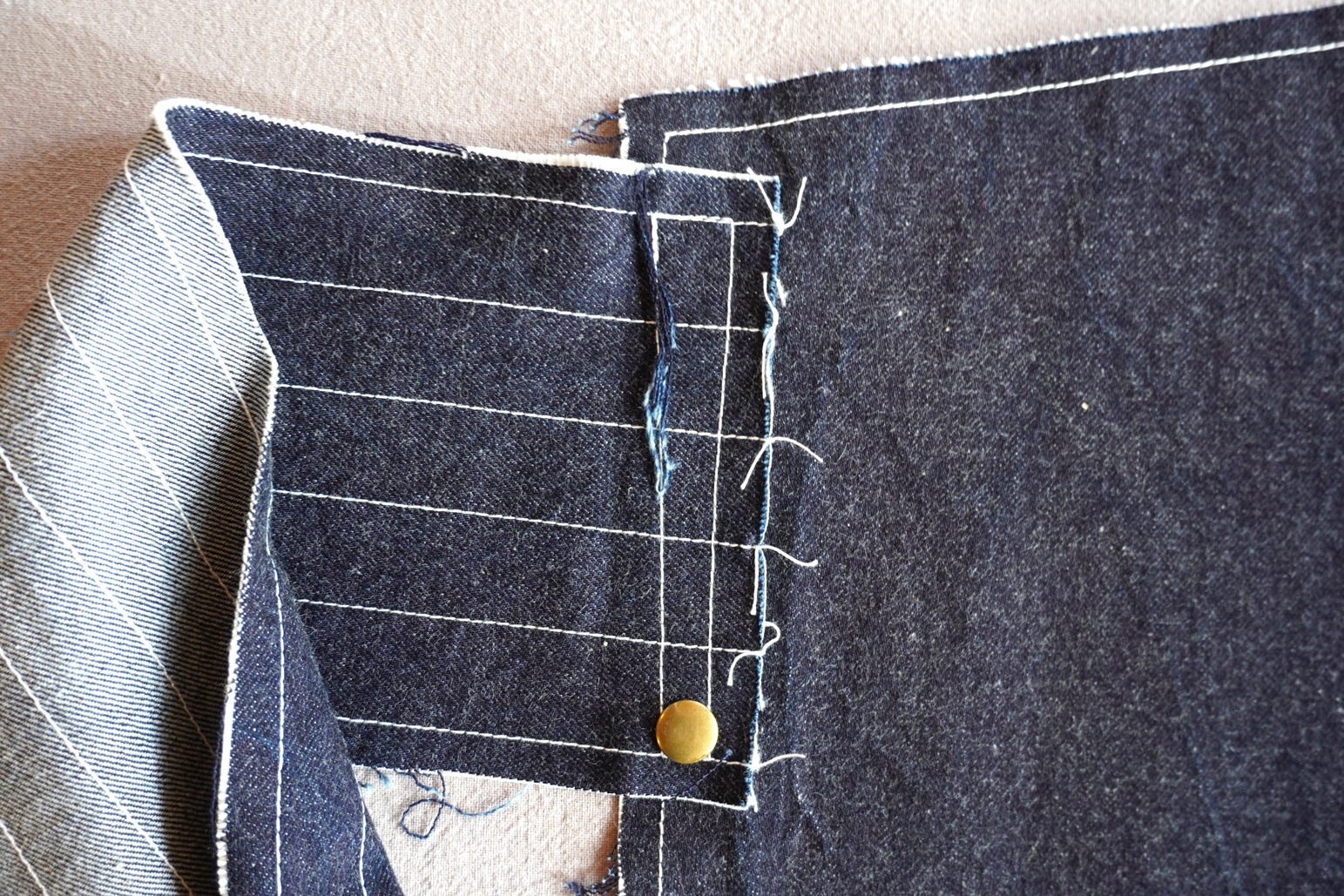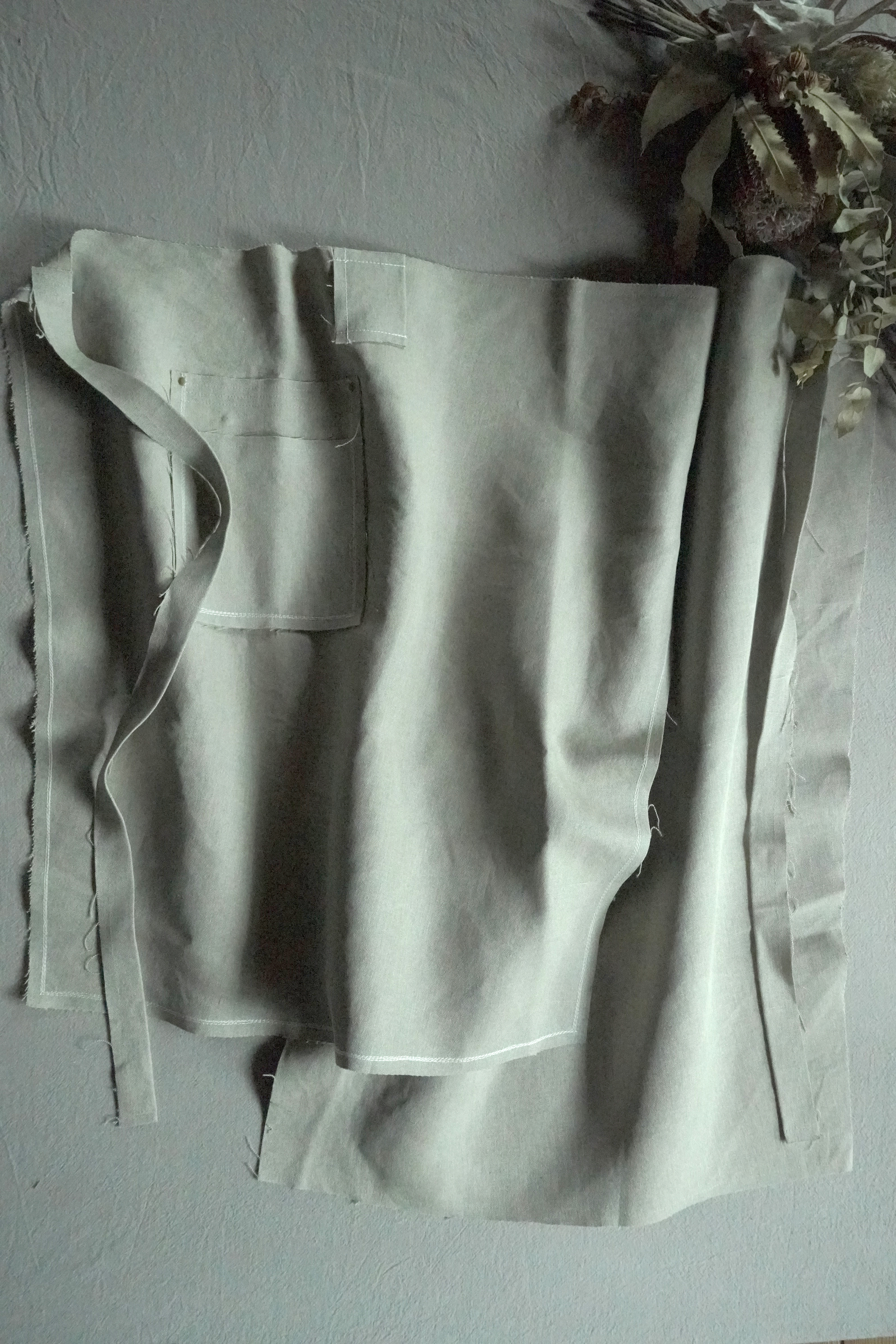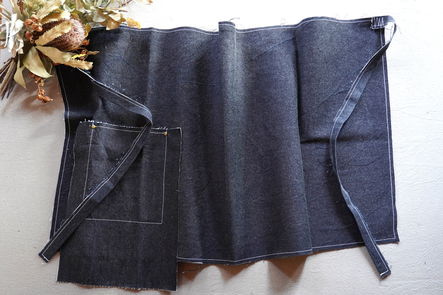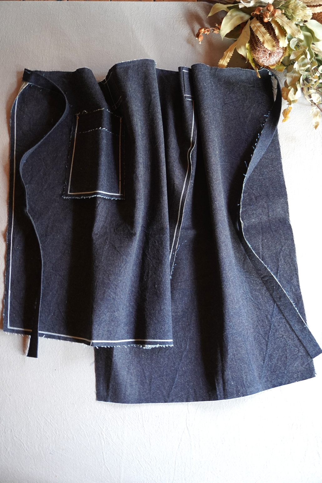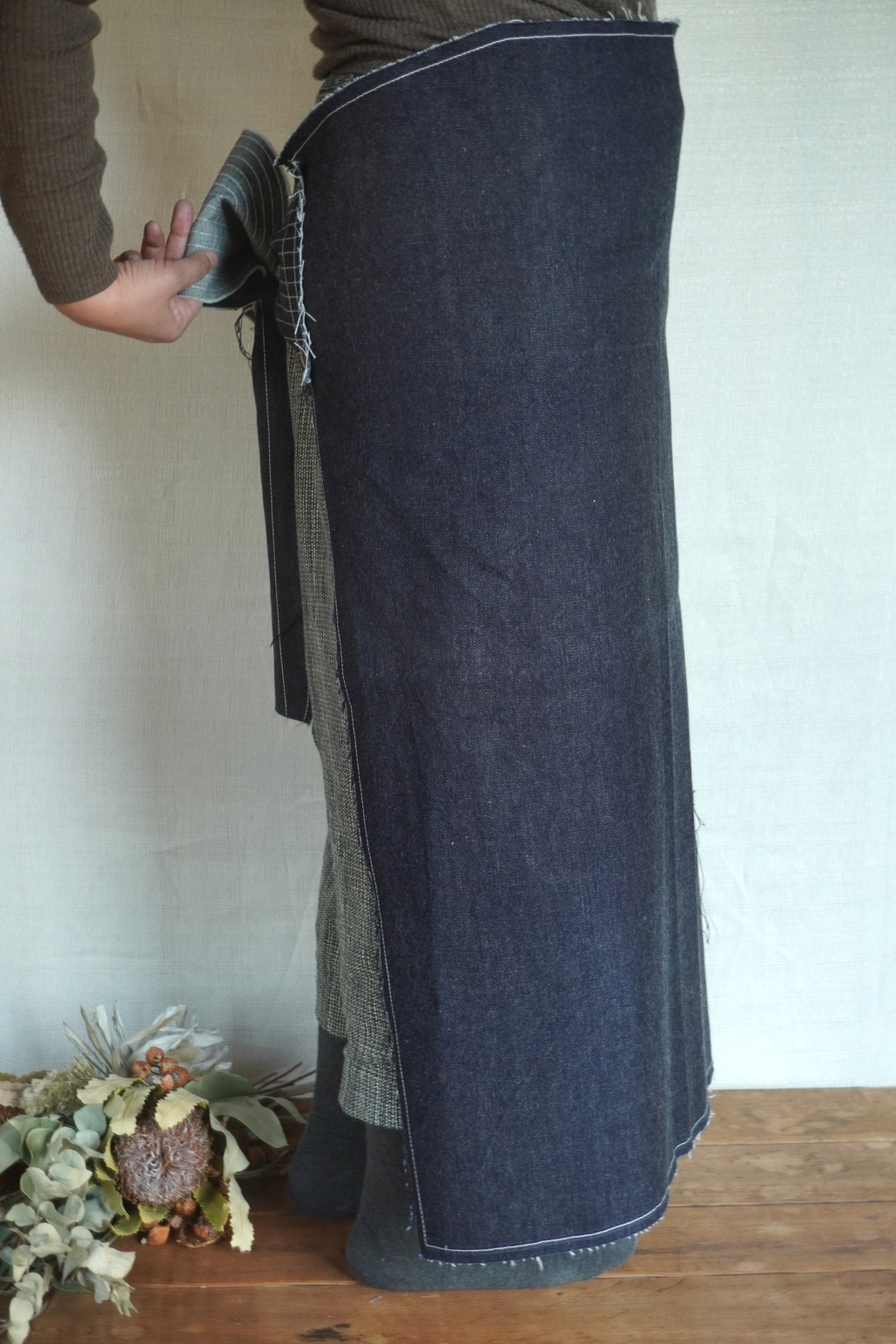デニムやリネンのほつれをデザインとして楽しむまえかけです。