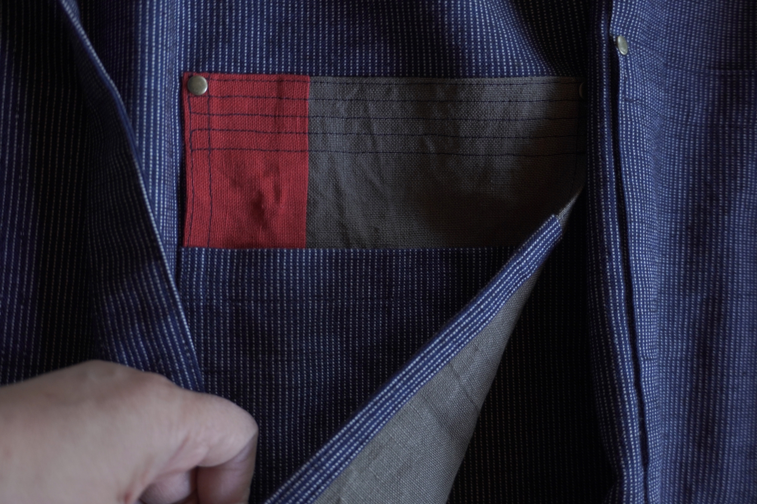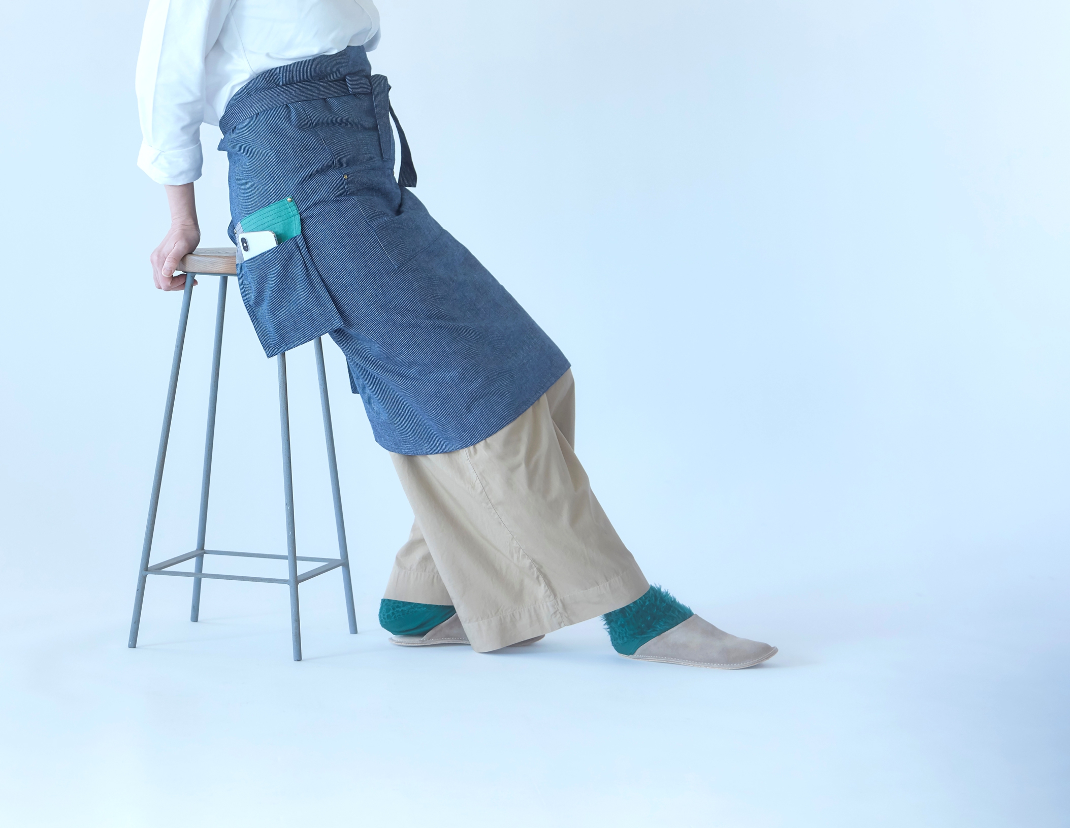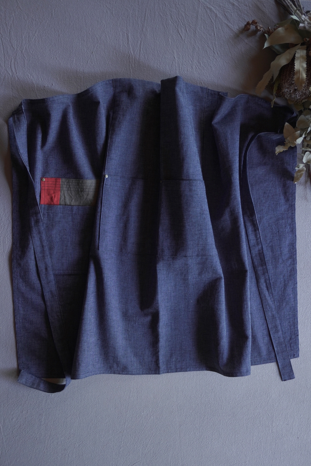 児島の生地で作られた、おしりにもポケットがあるまえかけ。